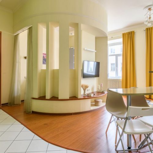 Уютные апартаменты, рассчитанные на 4 гостей, разместились в четырехэтажном историческом здании на Гороховой улице. В номере приятный светлый интерьер, дополненный яркими деталями. Апартаменты оснащены кухней с газовой плитой, посудомоечной машиной, микроволновой печью, выделена спальная зона. В ванной комнате установлена душевая кабина, есть стиральная машина и фен. Среди удобств – телевизор, гладильные принадлежности и сеть wi-fi.